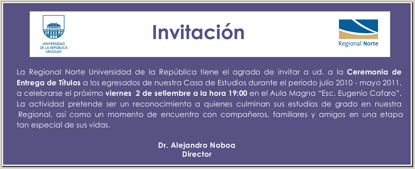 Unos 130 egresados en el último año de ocho carreras universitarias de Regional Norte de la Universidad de la República recibirán su título el próximo viernes 2 de setiembre en acto a celebrarse en el Aula Magna “Esc.