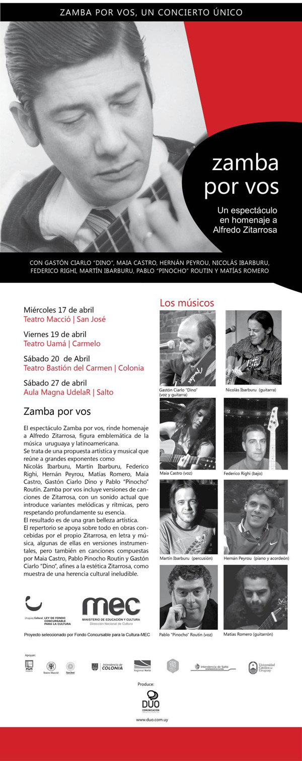 El sábado 27 de abril el recital “Zamba por vos” por Fondos Concursables del MEC, con 8 destacados músicos nacionales en escena homenajeando a Alfredo Zitarrosa. Actúan Dino Ciarlo, Maia Castro, Nicolás y Martín Ibarburu, Pablo “Pinocho” Routin, Matías Romero, Federico Righi y Hernan Peyrou. Entrada gratuita.