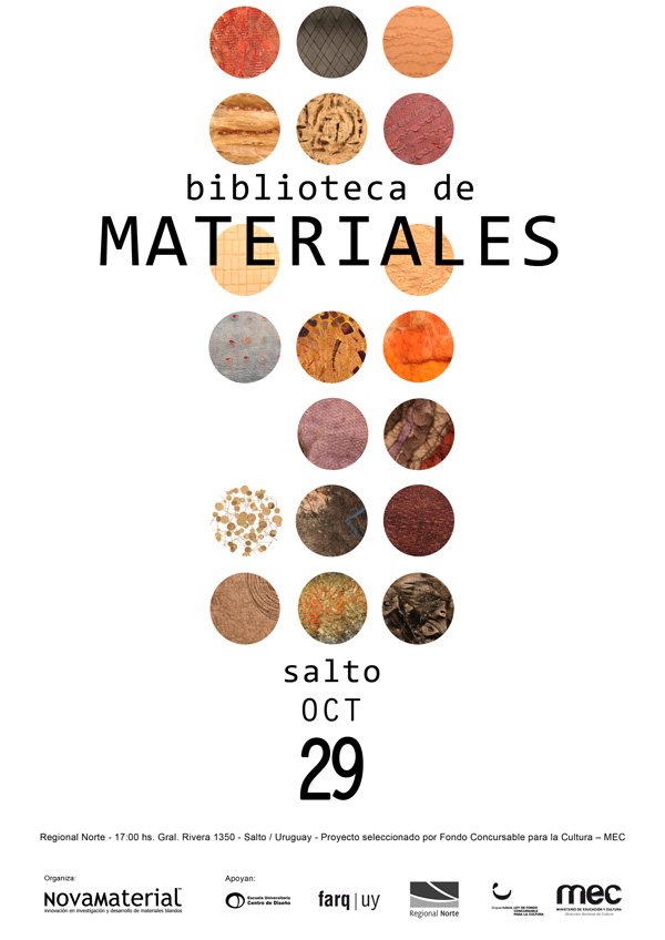 El martes 29 a las 17:00 se inaugura la exposición “Biblioteca de materiales”, organizado por NovaMaterial. El mismo es un proyecto premiado por los Fondos Concursables para la Cultura del Ministerio de Educación y Cultura (MEC) y cuenta con el apoyo de la Escuela Universitaria Centro de Diseño de Facultad de Arquitectura Udelar y Regional Norte.