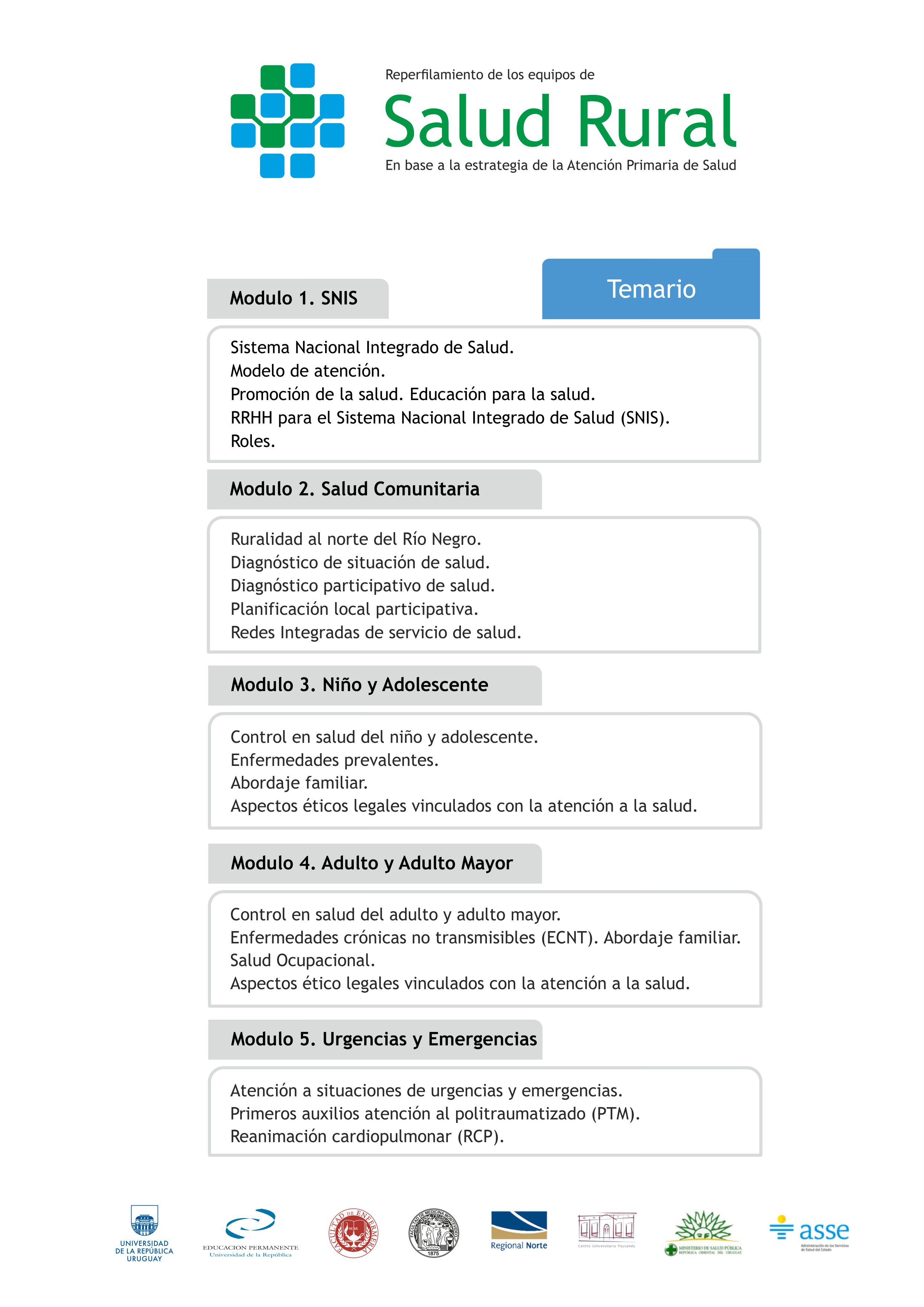 Este Programa es organizado por: Universidad de la República, Programa de Educación Permanente Facultad de Enfermería, Facultad de Medicina (Áreas de Salud Comunitaria) y Cenur Noroeste. Ministerio de Salud Pública, Área Salud Rural y Direcciones Departamentales de Salud. ASSE: Redes de Atención Primaria.