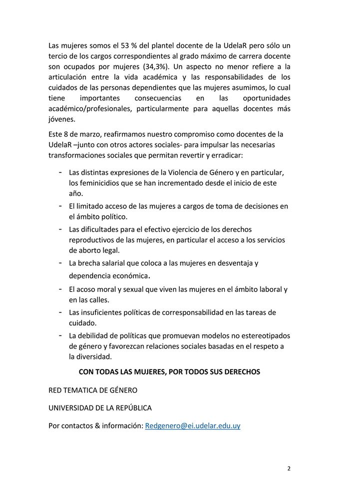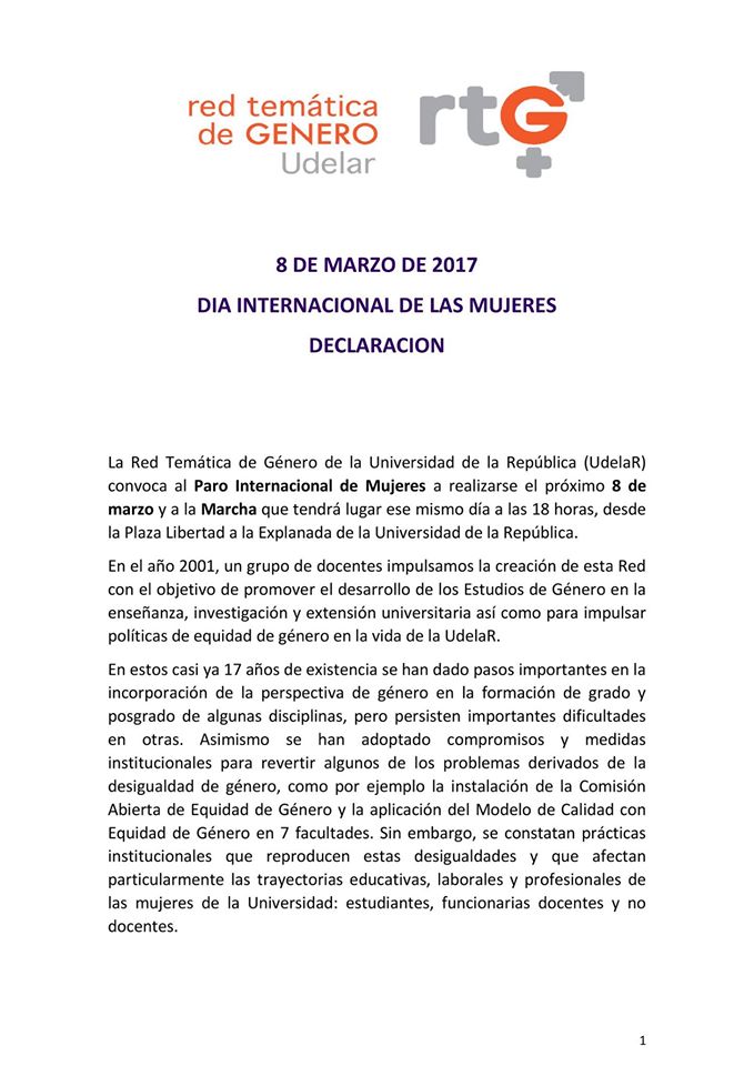 Compartimos la Declaración de la Red Temática de Género de la Universidad de la República, en torno al paro del 8 de marzo, Día internacional de la mujer.