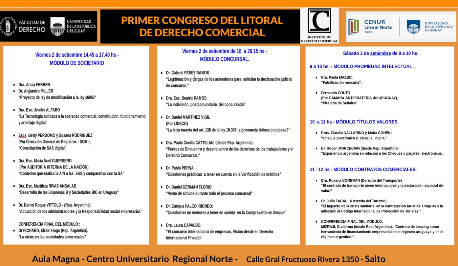 "Actualidad del Derecho Comercial, Societario, Concursal, Propiedad Intelectual y Contratos Comerciales", se realizará presencialmente en Salto (Aula Magna) y será trasmitido por el canal de YouTube del CENUR LN.
