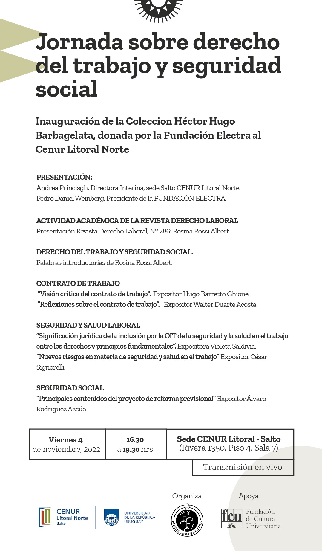 El día viernes 4 de noviembre de 16:30 a 19:30 se llevará a cabo la Jornada sobre Derecho del Trabajo y Seguridad Social. Dentro de la cual se procederá a la Inauguración de la Colección Héctor Hugo Barbagelata, en la Biblioteca de la sede Salto del Cenur Litoral Norte de la Universidad de la República.