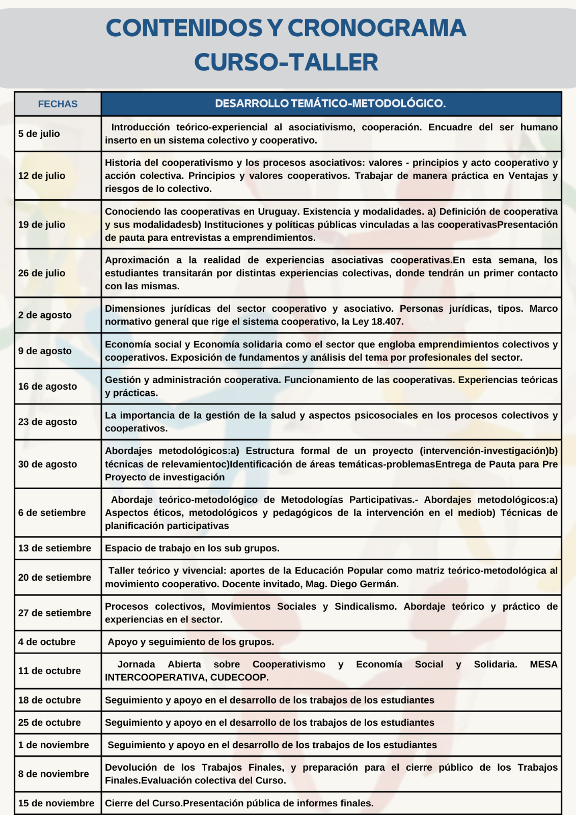 La 12ª edición del Curso de COOPERATIVISMO y ECONOMÍA SOLIDARIA, comienza el miércoles 5 de julio hasta el 15 de noviembre de 2023, en el horario de 18:30 a 20:30, en la sede Salto del CENUR LN de la Universidad de la República (Rivera 1350).