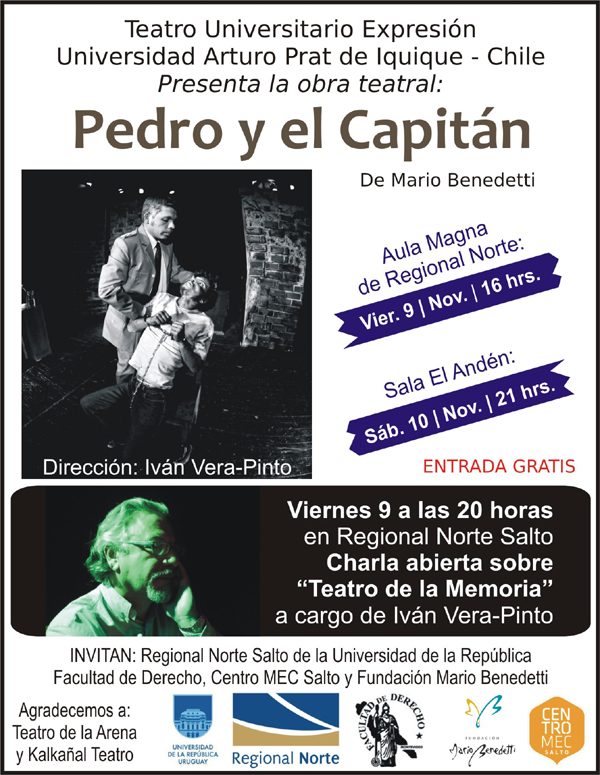 La célebre obra del prolífico autor uruguayo Mario Benedetti, “Pedro y el Capitán”, se presentará el próximo viernes 9 de noviembre a las 16 horas en el Aula Magna de Regional Norte Salto, y el sábado 10 a las 21 horas en sala El Andén. Ambas funciones con entrada gratuita.