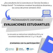 Entre el 11 y 17 de julio se encontrara disponible la Encuesta Estudiantil de evaluación de los cursos y docentes para las Licenciaturas en Ciencias Sociales y Trabajo Social, así como también Ciclo Inicial, del primer semestre 2022.
